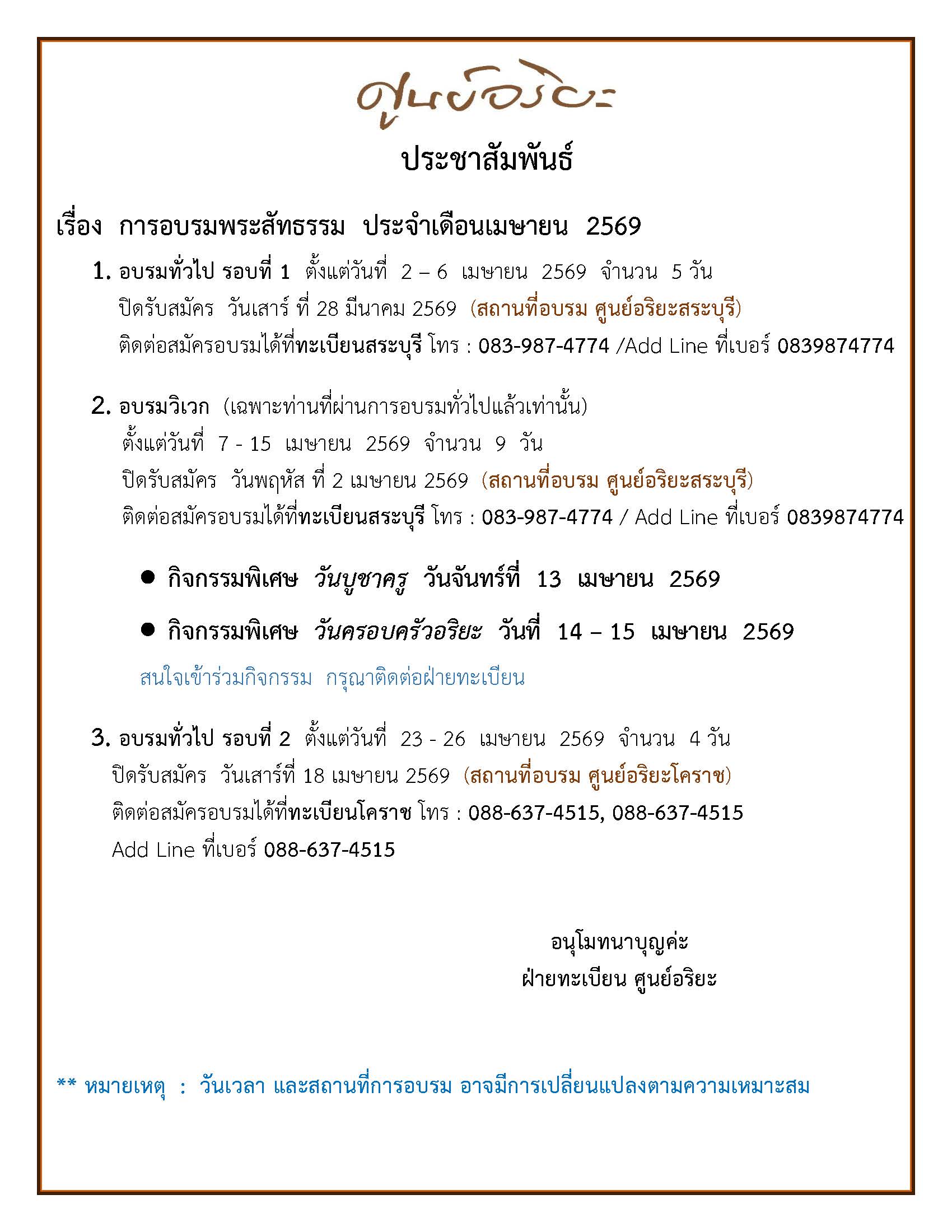 ประชาสัมพันธ์ปฏิทิน การอบรมพระสัทธรรมความจริงแท้ ที่มีค่ายิ่งชีวิตของศูนย์อริยะ ปี 2569 (อาจเปลี่ยนแปลงได้ตามความเหมาะสม)